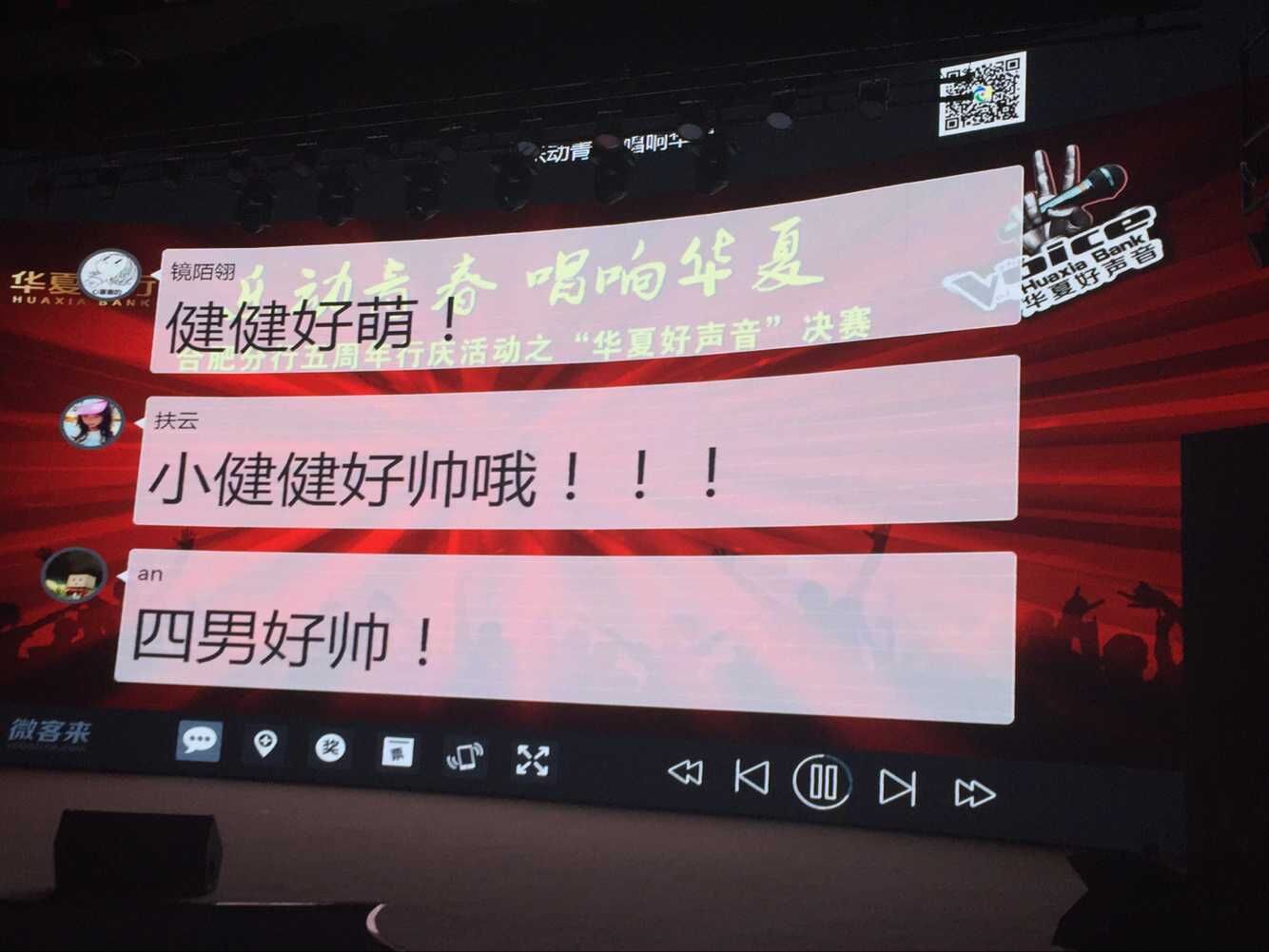比赛开始之前,所有观众通过扫描节目单上的二维码,关注“皮诺客科技”,并在公众号里回复“华夏银行”字样,便可实时发布自己的所感、所想,或是为自己喜爱的选手加油喝彩。皮诺客定制的微信墙会实时同步互动信息,让每个人轻松“上墙”。
