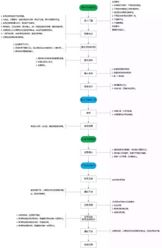 另外,“帐号迁移”不是微信免费项目,需另支付审核服务费300元。在审核通过,双方管理员确认同意迁移后,微信会给原帐号下发通知,粉丝在3天内有选择是否取关的权利。